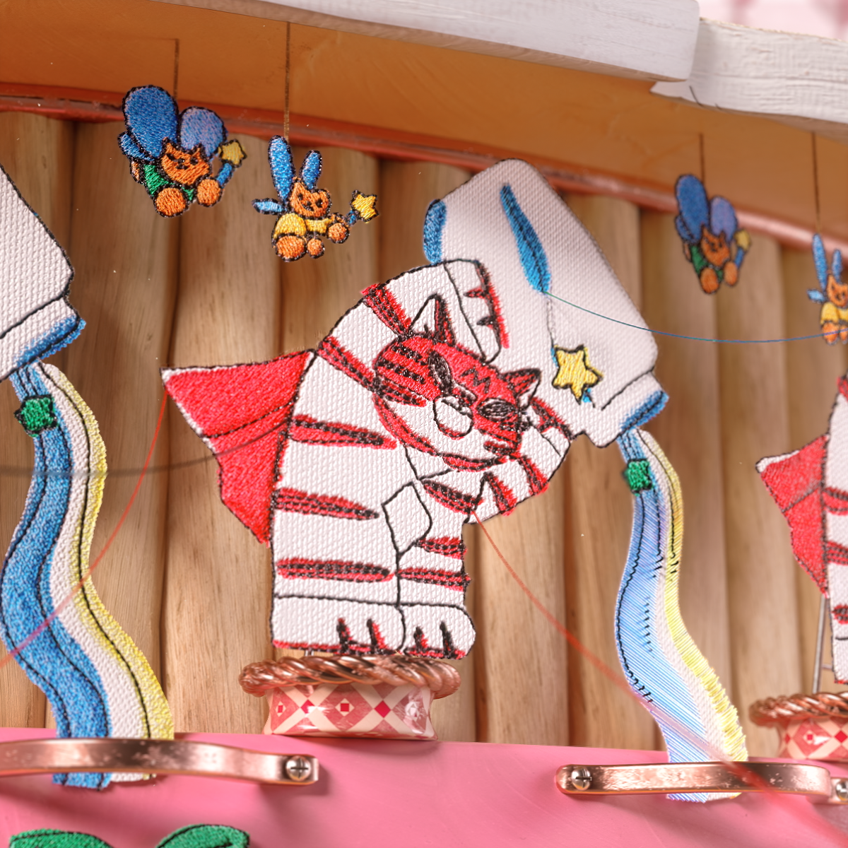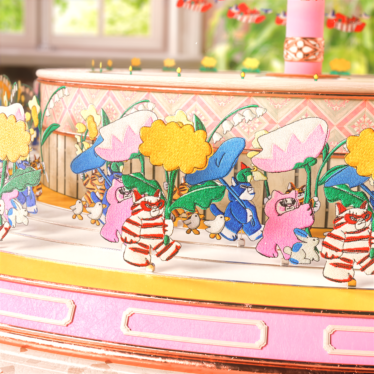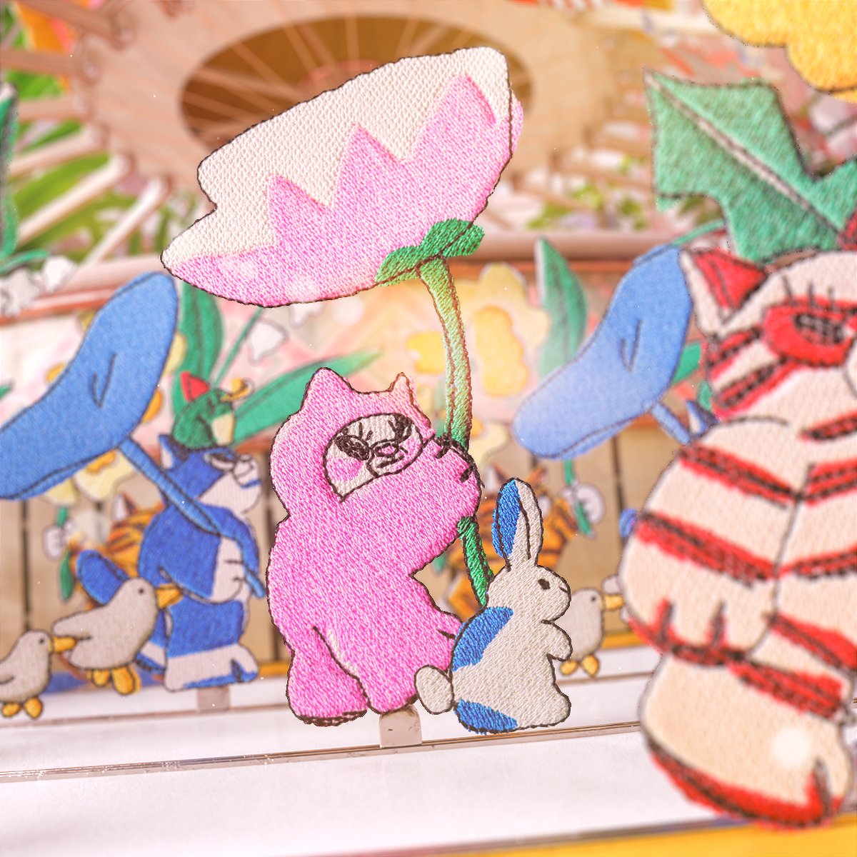 가느다란 실과 천으로 가장 작은 단위를 엮어가며 만들어낸 그림으로 세상 속 빈 곳을 채웁니다. 자수 작업으로 잘 알려진 고주연 작가의 오리지널 캐릭터 콘텐츠 ‘셔레이드쇼’의 주인공 코비를 통해 생명의 순환과 봄의 역동성을 주제로 한 이야기를 펼쳐냅니다. 개미들이 씨앗을 옮기고, 새싹과 꽃이 피어나며, 봄비가 내리고 개구리들이 점프하는 등 봄의 다채로운 풍경은 자수와 조이트로프 기법을 활용해 생동감 있게 표현됩니다.